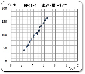 EF61-1号機と殆ど同じパターンですね。遷移点が1グラム程度なので、減速部の摩擦抵抗が小さいようです。このためなのか、制動領域でのデータが垂直の部分は、やはり測定できませんでした。抵抗制御の場合でもこの程度のデータしか収集できませんでした。わずかな違いで上下の部分に固まってしまうのです。