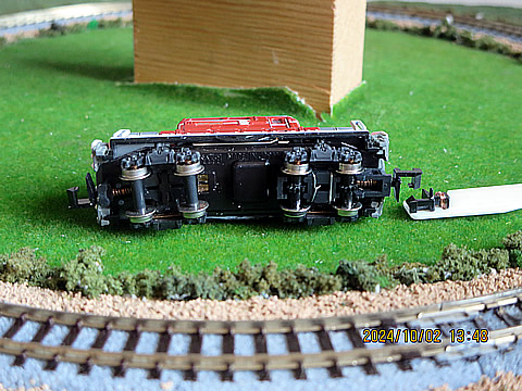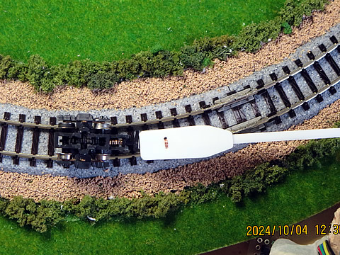 先回の C56-144号機の場合の様に、駆動力や制動力を発揮している動力部に対して、測定は真っすぐに実施しているだろうか、の疑問に対し、ストック品の動力台車部を線路において、目視ながら確認しました。下の写真。