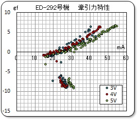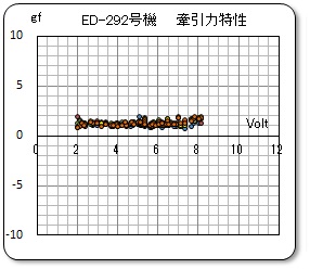 今回のターンテーブル機構はモータによって駆動されているので、回転数とトルク、即ち、車速と牽引力はこのモータ駆動特性に影響されます。先回の「小型のターンテーブル式実験装置を作ろう 実験開始」(2024/9/19)にて報告した実験その2のデータを、今回のED292号機の測定データにスケールを合わせて重ねてみました。右のグラフです。横方向位置は少し修正しています。