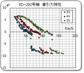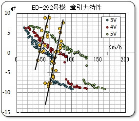 実験その2の特性はターブル側、即ち線路側の特性です。一方、ED292号機の特性は車両の動輪の特性なのです。このレールと動輪が接触して力をやり取りしている状態が走行中の状態なのですが、この場合は、力と速度は同じなのです。共有している状態です。これは、二つの特性線図が交差している点が、走行中の状態を表しているのです。