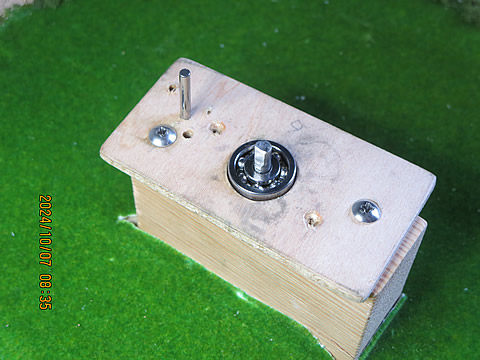 でも、途中からテーブル上部のベアリングがだんだん浮いてきて外れてしまうので、上右の写真のように、固定ネジを緩めた状態で金具をテープに貼り付けてベアリングの抜け止としている。もっと良い方法に改善すべきだが・・・・。