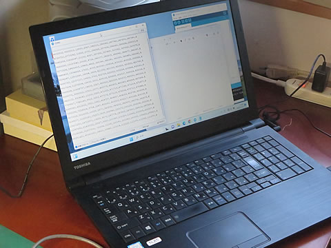 駆動用のモータ回路は安定化電源(下左の写真)を使用して供給電圧を調整し、モータの回転数を設定する。そして、回転センサとロードセルから送られてきたデータをArduino で処理し、シリアル通信によってパソコンに送信してくるのだ。送信されて来たデータは、シリアルモニタに表示させてデータの収集具合をチェックする。下右の写真。