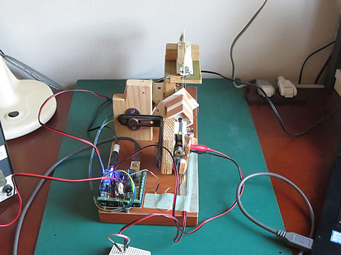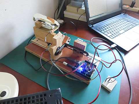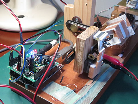 なお、Arduino に取り付けているシールドは、「バイナリカウンタの動作解析と対策」(2016/6/29)にて工作したシールドであり、Arduino に書き込んだスケッチは、「モータ特性を測定しよう その6 機能テスト」(2016/10/8)のスケッチを少し手直して書き込んでいる。ロードセルの読み込み回数を10個から5個に減らしただけですが。