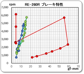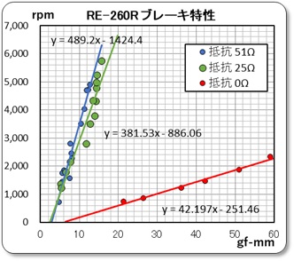 また、今回の予備実験中にアクシデントが発生した。その痕跡が上右のグラフに現れている。このグラフは、左のグラフに示したデータを測定順に線で結んでいるのだが、ご覧のように、0Ω測定中、駆動モータの電圧を上げていくと、突然回転数が跳ね上がってしまっている。その時は何が起こったのか分からなかったので、実験を続けたが、よく見るとブレーキ側のモータが停止していた。