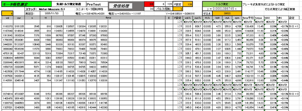 発電モータの負荷回路は、最初に 51Ω、25Ω(51Ωの抵抗を並列)、およびショート状態にして、駆動モータの電圧を変化させながら実施した。そして、シリアルモニタに示されたデータ列をコピーし、 Excel のシートに取り込んでデータ処理を実施した。その様子を下に示す。