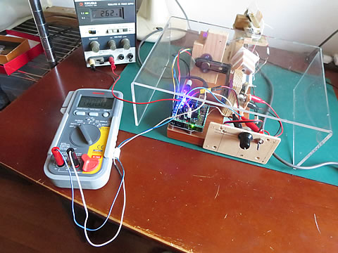 この測定は、同じ装置で測定できるので試しに実施した。負荷側のDCモータの回路をオープン状態にし、その時の発生する擦れ電圧と、回転数を測定するのである。オープン状態のモータ端子の電圧をテスターを使用して読み取るのである。テスターの接続状態を下に示す。