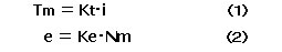 まず、モータの発電機能は、回転子に加えるトルク Tm によって電流 i が発生します。その関係はトルク定数 Kt で示されます。また、この時発生する逆起電力 eは、逆起電力定数 Ke と回転数 Nm とに関係付けられます。
