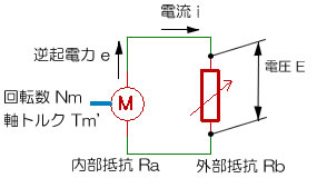 この逆起電力 e は回路に電気を流す力ですから、回路全体の抵抗値と流れる電流はオームの法則に従います。この時、外部から観察できるのは外部抵抗両端の電圧E ですので、これらの関係は、