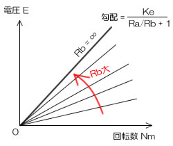 となります。式より電圧 E と回転数 Nm は原点を通る直線の関係なので、これをグラフに示すと右のようになります。そして、外部抵抗 Rb を大きくしていくと勾配は急になって行き、Rb max =∞が限界となります。この時、