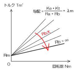 そして、オープ状態、即ち、Rb max =∞が限界となります。この状態は、電気が流れていませんので、機械的な回転数とトルクの関係となり、それはまぎれもなく、機械的な損失の状態を示しているのです。摩擦損失とは言っても、空気抵抗も含まれているかも知れません。その上、勾配値はλm を示しているのです。