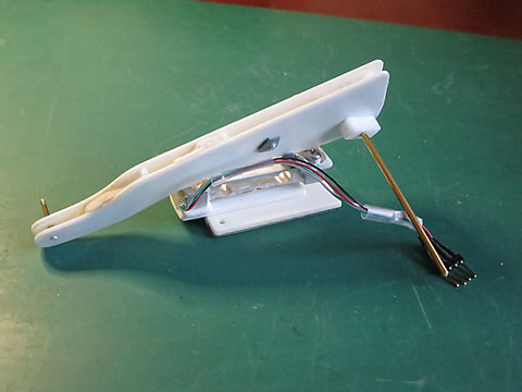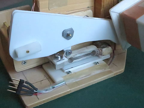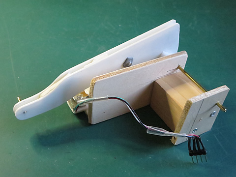 メインのレバーは厚さ1.5mm のプラ板を使用し、剛性を持たせるために2枚重ねにしています。ロードセルは今までの物をそのまま使用しましたが、リンクからの受け部は0.5mmのアルミ板を使って細工しました。ピンを使って連結していますのでレバーとロードセルは一体化しています。レバーの形状は何も考えずに工作を始めたものの、干渉する部分を避けていくと、上記のような形状になってしまいました。