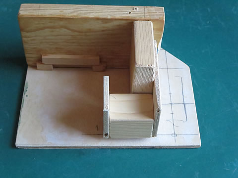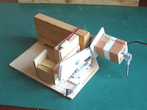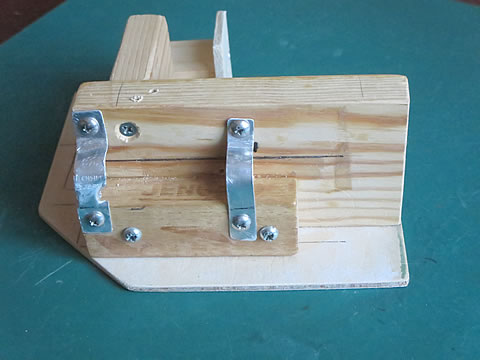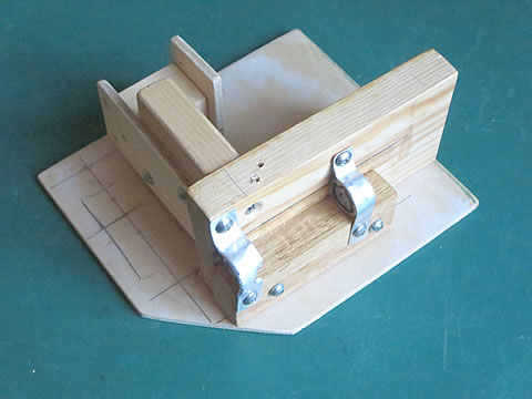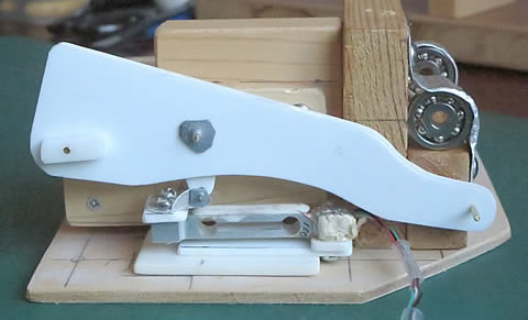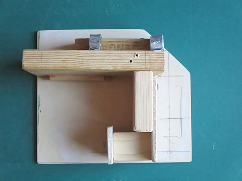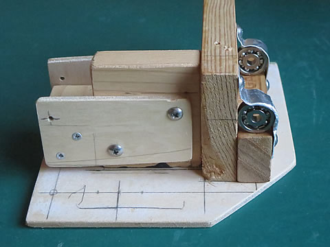 レバーの先端はスイング部とのリンク連結のためのピンを固定していますし。レバーの回転軸は、φ2.0mmの真鍮棒を固定しました。この棒がレバーの回転軸となります。そして、この軸を支持する部材を木片を使って工作しました。下の写真。