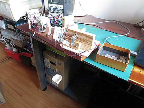 動作の確認と較正作業を実施しました。トルク測定部のユニットを机の端に設置し、トルク受け部の端に設けたピンに糸を掛けてここに重り用の籠をつるしました。ピンの位置はあらかじめ測定しておきました。レバー長は 17.0mm です。