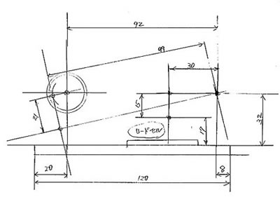 負荷を受けるスイング部の位置は変更しないで、レバー構成を下左の図のように検討した。どのような形状にするかは決めていたので、図面には寸法関係しが描いていません。形状は完成した時の写真を下右に並べて示します。但し、左右は反転している状態です。