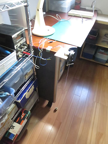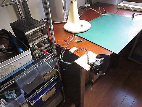 モータの電源は電圧が調整できるように安定化電源を使用しました。モータ配線ケーブルは、モータ用電源端子のみ接続しています。