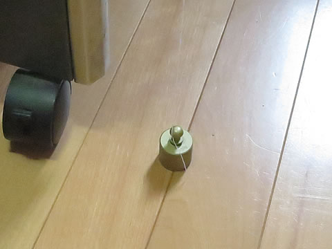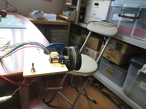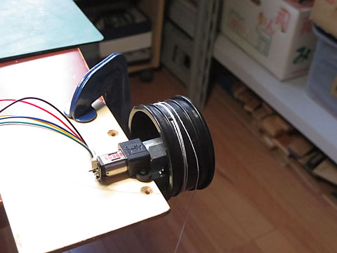 この部品をベニヤ板に取り付けて、工作机の端に固定した状態でテストを実施しました。右の写真に示す。 巻き取りドラムの部分には糸を巻き付け、糸の先端には 100 グラムの分銅を結びつけ負荷としました。