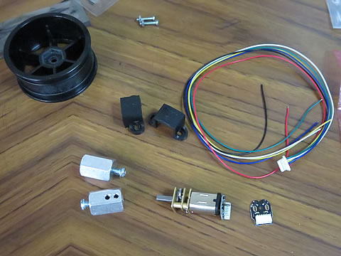 ロボテックス用超小型モータと言えども、あまりにも小さいので簡単な機能チェックを実施することにしました。関係する部品を下左の写真に示します。仮組付けを実施した状態を下右の写真に示します。