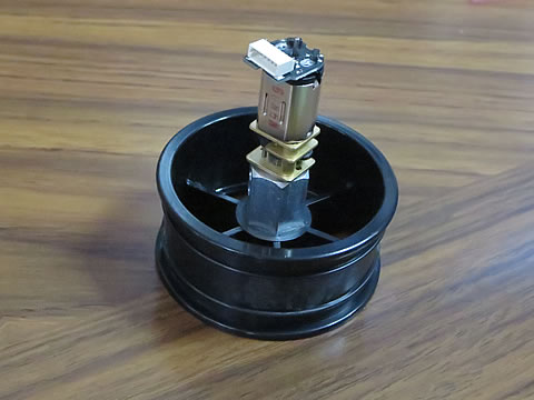 巻き取りドラムは、タミヤのタイヤ付き車輪でしたが、タイヤを外し中央部の溝の文字部分を削って綺麗にしました。ドラムとしての直径は φ48mm でした。それにしても駆動部は小さいですね。