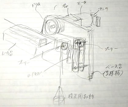 まず、アイディア・スケッチを描いてみました。右の図です。測定車のカプラーを引っ張る糸をプーリーを介してドラムに巻き取っています。そして、糸を巻き戻しながら測定車を走行させます。この時の糸の張力をプーリーに設けたロードセルで測定します。