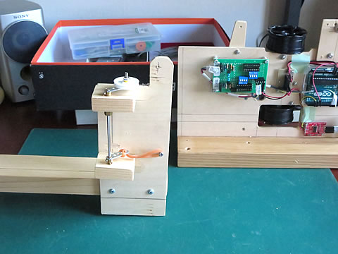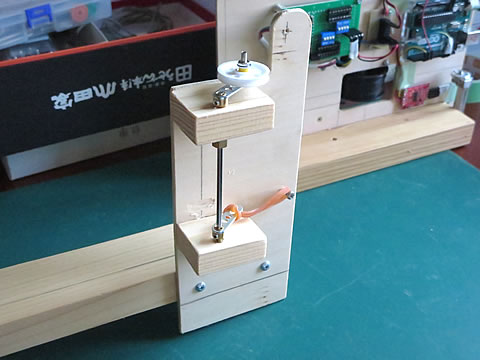 そのからくりを終端側の滑車に細工しました。とは言っても滑車を保持するレーバー軸に、輪ゴムによるバネ力を掛けるようにしただけですが。