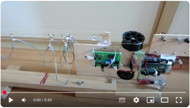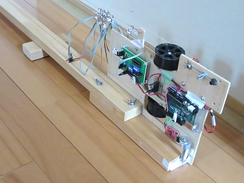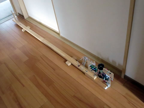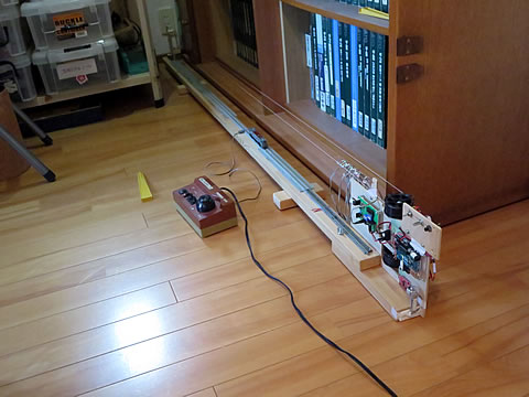 粘着特性(μ特性の名称を変更します)を測定するための装置を作っています。予備実験用の装置として、動力車のモータ回転数を検知するセンサの信号用ケーブル処理方法を検討する。今回は架線方式を工作しました。さらに、車両走行用のレールも設置しました。