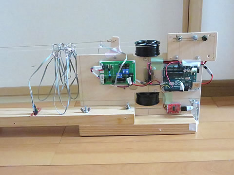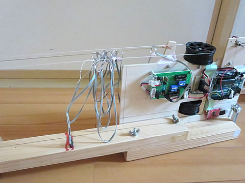 次に架線と 牽引ロープ(糸ですが・・・・)を用意しました。通信ケーブルは、この架線につるした金具に取り付け、そのケーブルの先端部に牽引糸を固定して、駆動ドラムに巻き付けるという算段です。