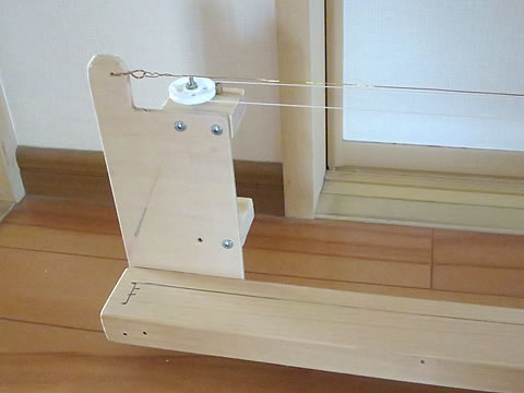 次に大工さんが使う水糸(?)用のナイロン製の糸を使って、駆動ドラムと滑車の部分に張ります。