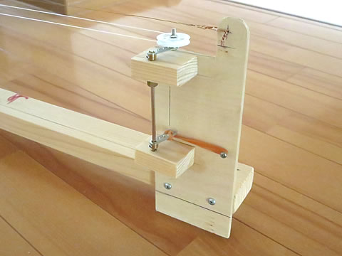 信号ケーブルの駆動部は工作済みなので、終端側の滑車を作ります。架線の張力保持は設置時に実施すれば良いのですが、ケーブルを移動させる牽引ロープは常にある程度の張力が掛かるようにしておく必要があります。これは駆動部のドラムに巻き付けたロープをすべりなく引張るためには、常に一定のテンションをロープに掛けておく必要があるからです。