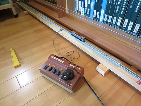 次にレール台の上にレールを取り付けました。当初はKATO製のレールを想定していたのですが、ストック品にあったレールエンドはTOMIX製のレールを使っていたのでこちらに変更します。レールエンドは、「卓上レイアウトで楽しもう その26 再開する」(2020/11/7)で使用していたものです。でも、信号処理のために追加した基盤部品は一部配線が切れていたので、取り外しています。予備実験の場合は必要なかったので、運転の自動化工作の時に修復することいします。