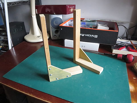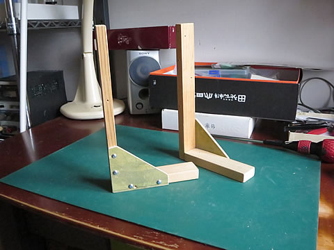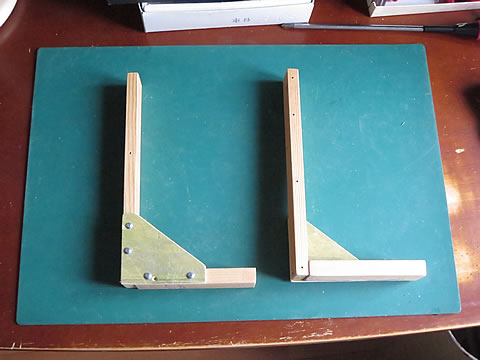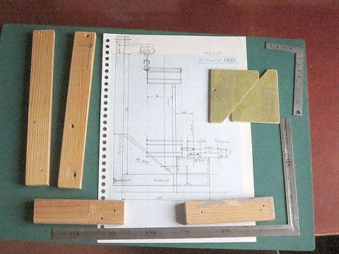今回の場合は、寸法関係など、さすがに図面を引いておく必要があったのでグラフ用紙の上で図面を作成しました。そして、それに従って木材を加工しました。下右の写真。