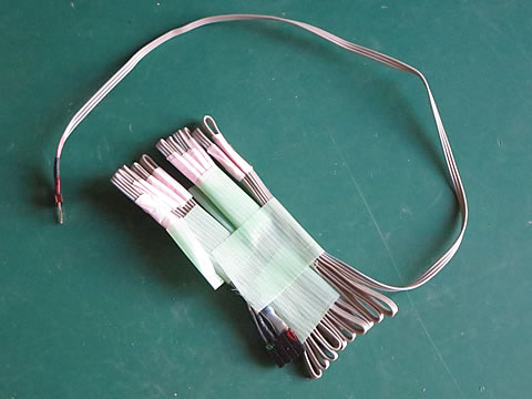 次に、保持する信号線の処理方法を改善しました。蛇腹をイメージして伸び縮み出来るように、信号線に折りたたみ癖を付けようとしました。下左の写真。屈曲性のあるものの、ねじり癖がついてしまったTOMIXのセンサ用信号線ですが、MTテープを使って折りたためるように端部を結び、仮止めテープを使って癖付けをしました。しばらくして、仮止めテープを外して展開した状態を下右の写真に示します。これなら何とか行けそうです。