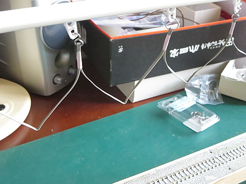 この支柱をレール台に取り付けました。レールの中心からかなり離れた位置で信号線を保持するようにしています。
