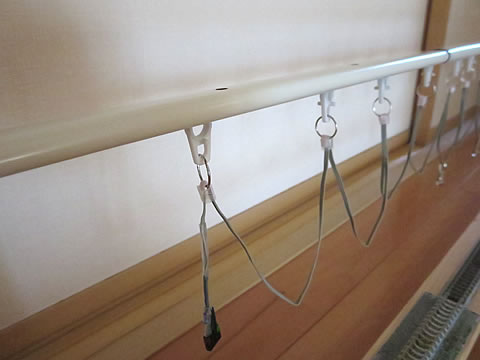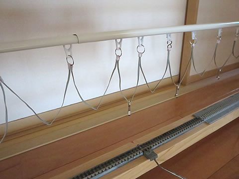 そして、カーテンレールに吊るしてみました。輪っかの部分の角度を合わせるために、中間に金属製のSカンや輪っかを使用しています。