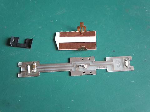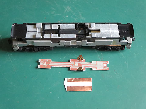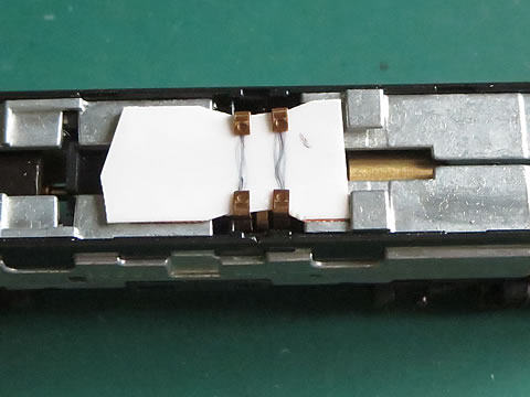 でもその位置は上部の照明基盤が邪魔をしているのだ。試しに基盤無しでレールの上に置いて見たが走り出さなかった。モータへの通電経路が必要なのである。そこで以前の測定方法を調べてみたが、部品の痕跡やメモ書き等の記録が見つからなかった。そこで、新しく作ることにした。0.5mmのプラ板に0.1oの粘着剤付き銅板を貼り付けて、応急的な通電基盤とした。下の写真。