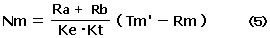 次に、モータコイルの回転によって発生する電流 i は、(2)式に示すように、トルク定数 Kt の関数となります。そして、この時発生する逆起電力 e は、(3)式のように、逆起電力定数 Ke と回転数 Nm とに関係付けられます。