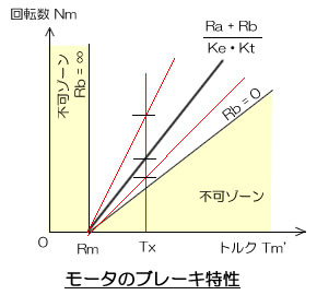 負荷トルクが Tx の場合、力のバランスにより、上に示した式(5)によって示される特性直線との交点がその時のモータ回転数となります。