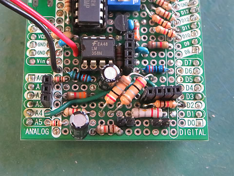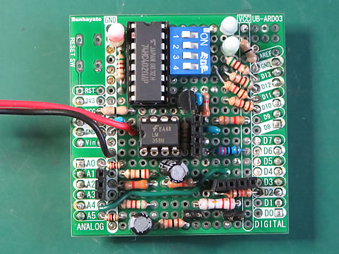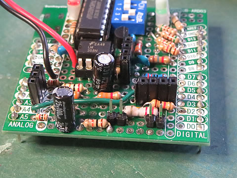 このシールドを測定台に固定しているArduino UNO の上に被せた状態を下に示します。