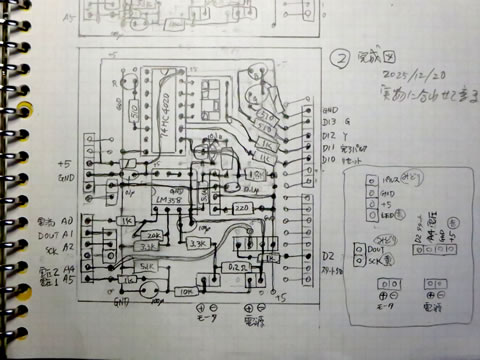回路図が出来上がると、いつものように実体配線図を描きます。5mm 升目の用紙を使って書き込んで行きます。下左の写真。今回使用したボードは、以前何かに使っていた物で、これを再利用しました。スルーホールの両面基盤です。どこかのメーカ品です。