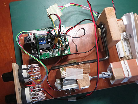 でも、この回路では較正作業が出来ないことがすぐに判明した。それは、乾電池の端子では 1.5volt もある電圧がモータ端子では 0.3〜0.4volt しか出ていないのである。その原因は、回路途中のの電圧降下量が大きくて、充分な範囲での較正作業が出来ないと判断したのである。