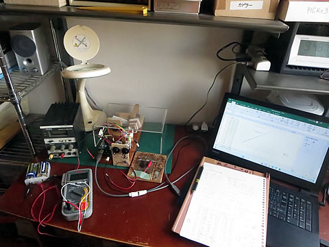 また、パソコン側の処理は、電圧値だけを送信するようにし、そのデータをシリアルモニタにて表示させるように簡素化しました。電源のメータの読み、テスタの読み、モニタの読みをそれぞれメモしておき、最後にExcelにて整理しました。この時の測定回路を上に、測定結果を右に示す。