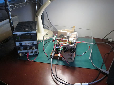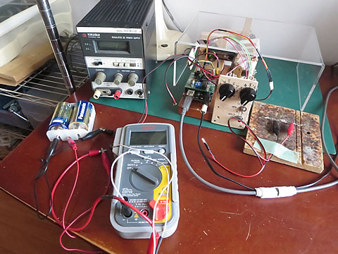 となり、今までの回路と殆ど同じですね。即ち、回路機能は合格と判断しました。 また、電源のメータの読みとテスタとの読みの差は、0.2volt以下だったので同じデータと判断して処理しました。 測定時の状態を下に示します。