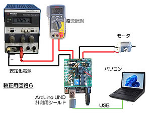 次に電流測定部の較正を実施しました。分岐の無い回路にすれば回路中の電圧降下があっても流れる電流は同じなので、左のような回路で実施しましたが、モータによるデータの変動が大きく、電源のメータやテスタの表示を読み取ることが出来ませんでした。
