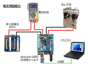 何時も使用している安定化電源は、max 1A までの電流しか流せないので、単一乾電池を使って電源とした。右のイラストに示すように、負荷としてはモータを使用し、電流と電圧を同時に測定できるようにした。Arduino からのデータはExcel に自動的に取り込むとともに、テスターの読みも手書きで書き込むようにした。