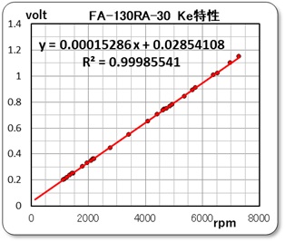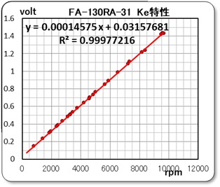電流がゼロの時、発生する電圧Eは、逆起電力定数をKe、ブラシ部電圧降下を Eb 、回転数をとすると、E = Ke・Nm + Eb となります。そこで、電圧 E と回転数 Nm の関係をグラフにして近似直線を求めます。すると、その式の勾配がKe となり、Y切片が電圧降下Eb を示すことになります。これによって求められたKe の値はカタログ値から求めた値とほぼピッタリです。また、 「カタログ値からDCモータの特性値を推定する」(2025/11/23)に示した単位の換算より Kt も計算できました。