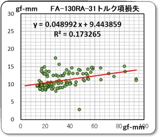 でも、No.30 のモータはやはり変なパターンとなっています。トルク損失は回転数と関係するとした考えでグラフ化したのですが、先回と同じようにその関係を見出せませんでした。そこで、速度項とトルク項に分解してグラフ化しました。 でもトルク項の損失は変なパターンです。 そこで、このモータに関してはトルク項を無視し、全てゼロとすることにしました.