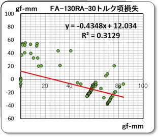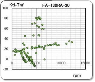 測定途中で違和感を感じながら実施ていていました。どうも様子が変でした。特に電流とトルクの関係を示すグラフが右上がりの直線に並ばないのです。 でもとりあえず測定を続行しました。 |