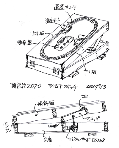 このサーボ部品を使って、新しい測定台のイメージ図を右に示す。 測定台の剛性を高めるために、台枠は60mm × 15mm の角材を使用し、筋交いなど入れて捻じり剛性を高めると共に、昇降部は、フラッパを新たに設けて持ち上げるようにした。