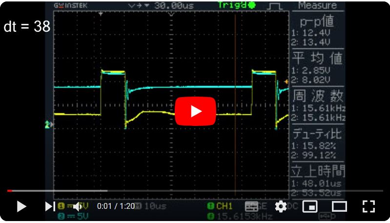今回は ROHM製のフルブリッジドライバ BD6231 を使って観察しました。 オシロで観察した結果は、動画で紹介するのが一番です。 選択ダイヤルの移動に従ってデューティ比が大きくなって行きますので、その時の波形の変化具合を観察してください。