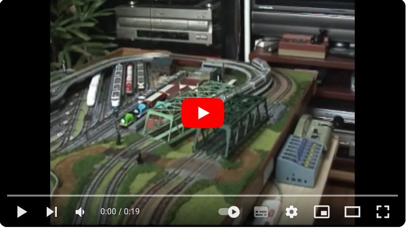 ムービーのアップロード第2弾として、S字カーブと曲線路の走行シーンを紹介いたします。 遠方の鉄橋からS字カーブに入り、カント付きの曲線路を通過していきます。 曲線路に入る時に、僅かに首を傾けるのが確認できます。 カントはいい加減に付けたのですが、なかなかいい具合に出来たなと自己満足しています。