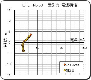 動力車の牽引力特性を測定する。駆動力の粘着限界は 6gf 程度であることが分かる。また、電圧によって電流値が増加しているのは、チップLED式の前照灯を組込んでいるためである。